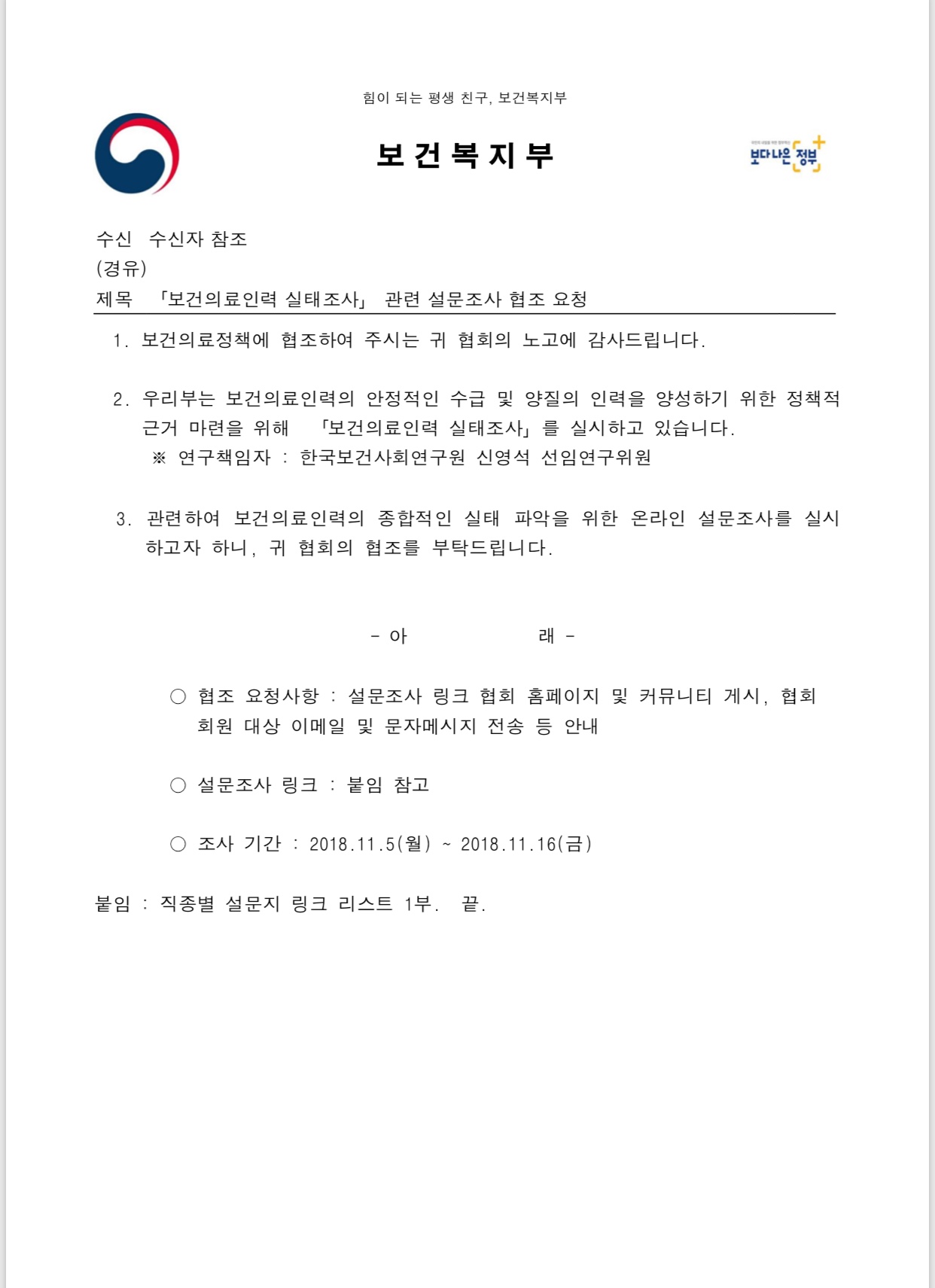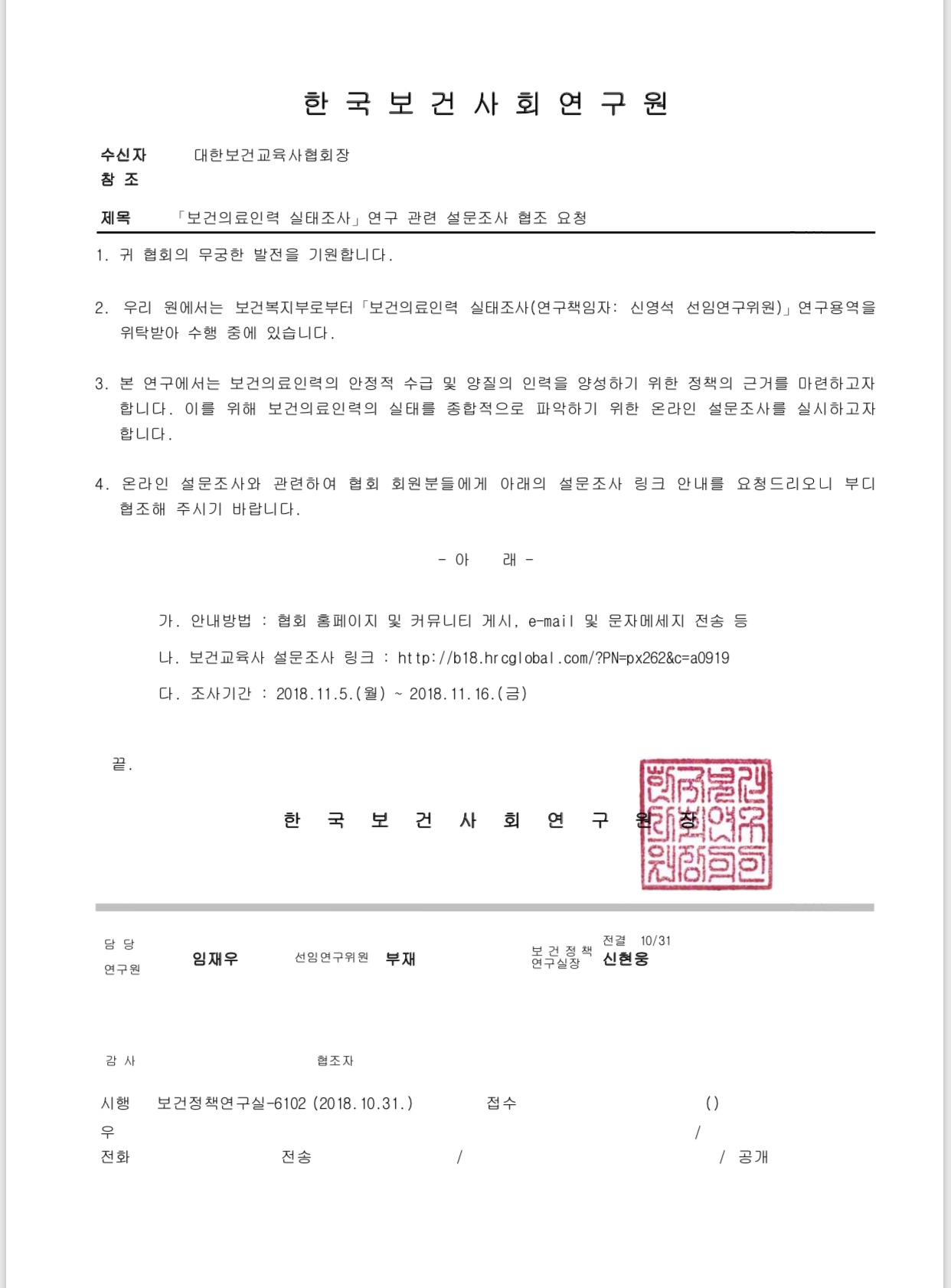 - ¾Æ ·¡ -°¡. ¾È³»¹æ¹ý : Çùȸ ȨÆäÀÌÁö ¹× Ä¿¹Â´ÏƼ °Ô½Ã, e-mail ¹× ¹®ÀÚ¸Þ¼¼Áö Àü¼Û µî ³ª. º¸°Ç±³À°»ç ¼³¹®Á¶»ç ¸µÅ© : http://b18.hrcglobal.com/?PN=px262&c=a0919 ´Ù. Á¶»ç±â°£ : 2018.11.5.(¿ù) ~ 2018.11.16.(±Ý)